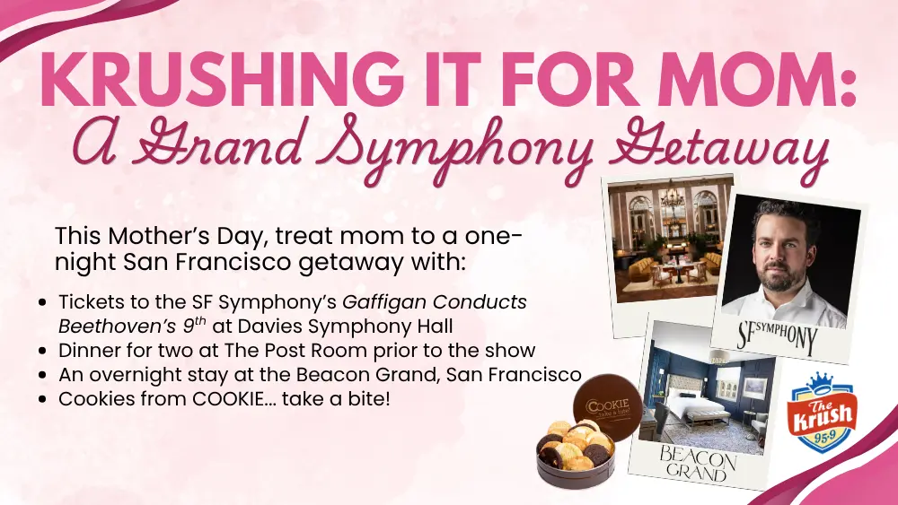 For the website contest, nominate your mom between Monday, April 13, 2026, at 6:00AM and Friday, May 1st at 7:00PM. On or about May 4, 2026, one (1) winner will be selected at random, and upon verification of eligibility, will receive two tickets to the San Francisco Symphony’s Gaffigan Conducts Beethoven’s 9th at Davie’s Symphony Hall on Saturday, June 20th at 7:30PM, along with dinner for two at The Post Room in San Francisco and an overnight stay for two at the Beacon Grand Hotel in San Francisco, plus cookies from COOKIE… take a bite! to be gifted to their mother. THE PRIZE(S) IN THIS CONTEST MAY NOT BE SOLD TO A THIRD PARTY OR TRANSFERRED TO ANOTHER PERSON. THE WINNER MUST BE ABLE TO ATTEND THE EVENT OR FOREFIT THE PRIZE(S). THE WINNER MUST ALSO NOT HAVE WON IN THE LAST 30 DAYS.